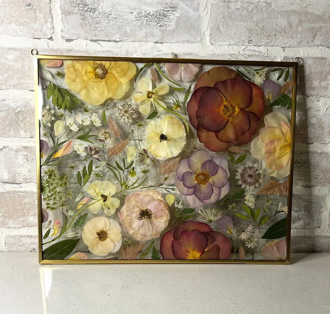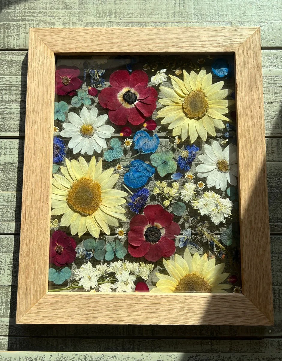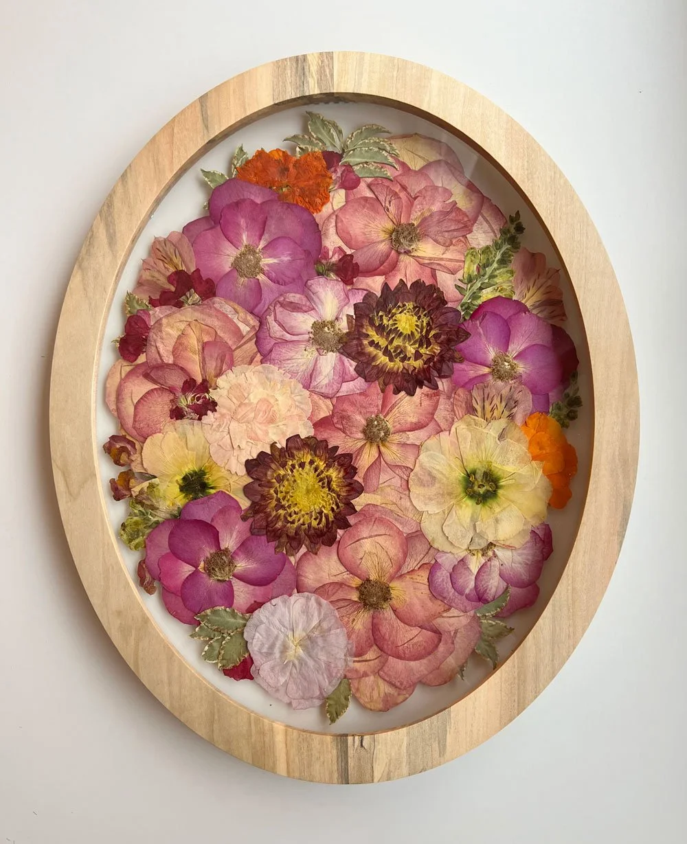 The most popular frame choice. These handmade custom frames are crafted from solid maple or oak wood to provide both timeless beauty and lasting durability. Each frame is designed with 99% UV-protective glass to help safeguard your florals. Available in 4 different sizes and designed to your preference.